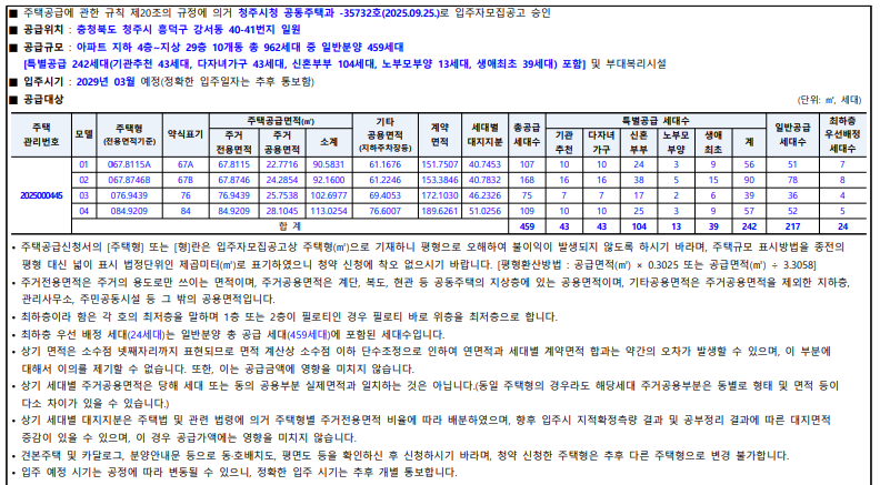 - 거주지 요건: 충북 또는 청주 거주자 우대 여부 / 해당 구역 거주 요건 적용 가능